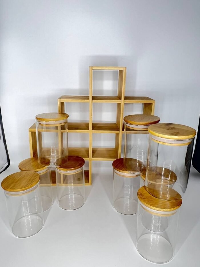 9pcs wholesale customized borosilicate food storage glass jar set spice with bamboo frame and bamboo lid